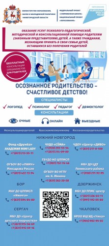 В Нижегородской области в 2022 году продолжается реализация мероприятия по оказанию услуг психолого-педагогической. методической и консультативной помощи родителям (законным представителям) детей, а также гражданам, желающим принять на воспитание в свои семьи детей, оставшихся без попечения родителей, в рамках федерального проекта "Современная школа" национального проекта "Образование". В 2022 году победителями конкурсного отбора от Нижегородской области стали 11 образовательных организаций, в том числе МБУ ДО ППМС-центр города Дзержинска.